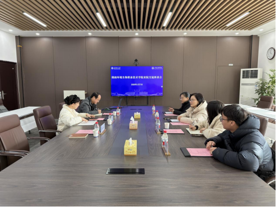 1月7日上午,湖南环境生物职业技术学院招生就业处处长石英、副处长邓阿琴、创业科副科长程度、科员崔诗昊一行人来院交流。卓越工程师学院党委书记杨晨、副院长杨现锋、创业园管理办公室负责人谭逸菲参加会议,会议由杨晨主持。