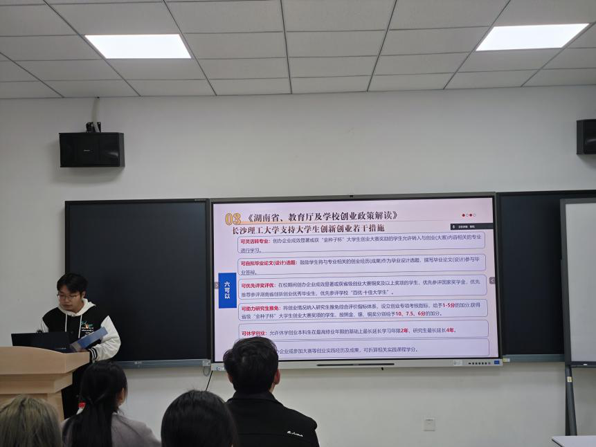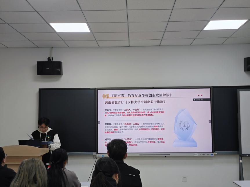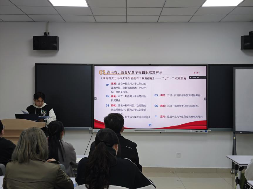 活动中,黄金同志详细解读了《湖南省大力支持大学生创业若干政策措施》的核心内容,重点介绍了“七个一”举措,并结合《支持大学生创业若干措施》《XK星空支持大学生创新创业若干措施》等文件,系统阐释了“两直接”“三优先”“两配套”及“六可以”等具体政策。针对学生群体,我们详细介绍了政策中的“六可以”,包括:创业经历及成果可折算学分、可替代毕业论文(设计)、创业学生可休学创业、可灵活转专业、可参评评优评先、可推荐免试保研。此外,黄金同志还介绍了本校大学生创新创业园的相关扶持政策,以及第二届“金种子杯”大学生创业大赛的实施方案,鼓励同学们,特别是作为高年级党员,积极把握政策机遇,带动广大学弟学妹锤炼创新本领,勇于投身创业实践。