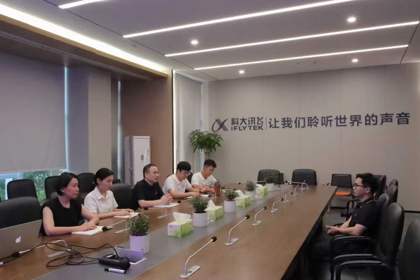参观结束后,双方在公司会议室开展了座谈交流,科大讯飞湖南公司高教行业总监秦隽皓、研究院智能硬件市场总监丁晓磊等公司代表参与了座谈。丁晓磊详细介绍了科大讯飞股份有限公司在人工智能技术研发、行业应用推广以及人才培养体系建设等方面的情况,特别是在智慧城市、智慧教育、智能制造等领域与高校合作开展的项目实践经验。陈华老师介绍了卓越工程师学院的建设背景、校企合作及人才培养等基本情况,表达了与科大讯飞进一步加强合作的期待。座谈会上,双方围绕人工智能赋能创新创业教育、学生实习实训、项目研究与技术攻关等多方面展开深入交流。