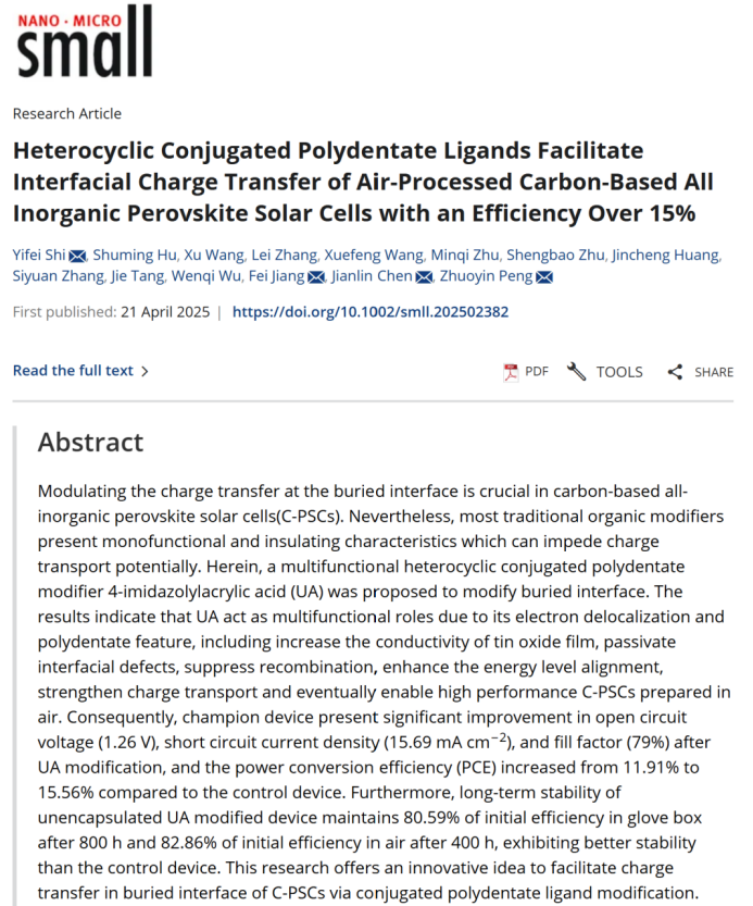 本研究成果以“Heterocyclic conjugated polydentate ligands facilitate interfacial charge transfer of air-processed carbon-based all inorganic perovskite solar cells with an efficiency over 15%”为题撰写的论文,已在国际顶级期刊《Small》(Q1区,影响因子IF=13.0,TOP期刊)发表。学院教师时一斐为第一作者及通讯作者,硕士研究生胡书铭为学生第一作者。此外,姜飞教授、彭卓寅教授和陈建林教授为共同通讯作者,电网防灾减灾全国重点实验室(XK星空)为第一完成单位。这项工作推动了空气中制备全无机钙钛矿电池的研究,探索了共轭多齿配体材料的新应用,深入探究了埋底界面中共轭多齿材料的影响效果和作用机理,为其他类型钙钛矿太阳能电池以及发光二极管、光电探测器、场效应晶体管等器件的研发提供了新思路。