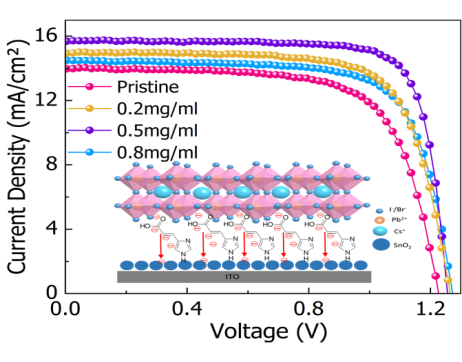 为解决这一问题,电网防灾减灾全国重点实验室科研团队提出了新方案:基于界面工程的策略,采用一种多功能杂环共轭多齿改性剂——4-咪唑基丙烯酸(UA),对器件的掩埋界面展开改性研究。同时,借助热空气流辅助旋涂法,成功在空气环境下制备出高效且稳定性良好的碳基全无机钙钛矿太阳能电池。研究成果表明,基于UA特有的共轭和多齿结构特征,大幅提高氧化锡薄膜的电导率,高效钝化界面缺陷,有力抑制复合反应的发生,从而助力获得高质量的钙钛矿薄膜,优化掩埋界面的能级取向,显著提升电荷传输效率。通过上述改性方法及制备工艺,最终实现了在空气环境中高性能碳基钙钛矿太阳能电池的制备。