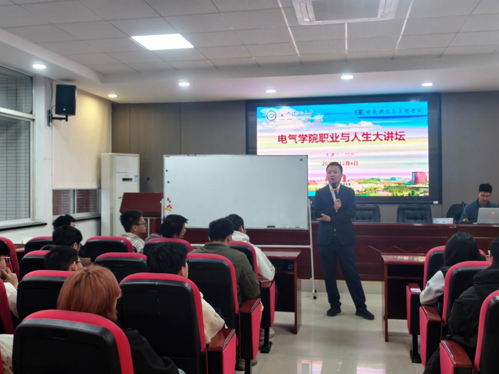 12月4日下午,电气与信息工程学院举办“职业与人生大讲坛”专题分享会,特邀2007级校友,现任国网山东超高压公司党委党建部主任、工会副主席付兴担任主讲嘉宾。报告厅内座无虚席,学弟学妹们怀着期待与憧憬,共同聆听了一场关于成长、选择与坚持的思想盛宴。