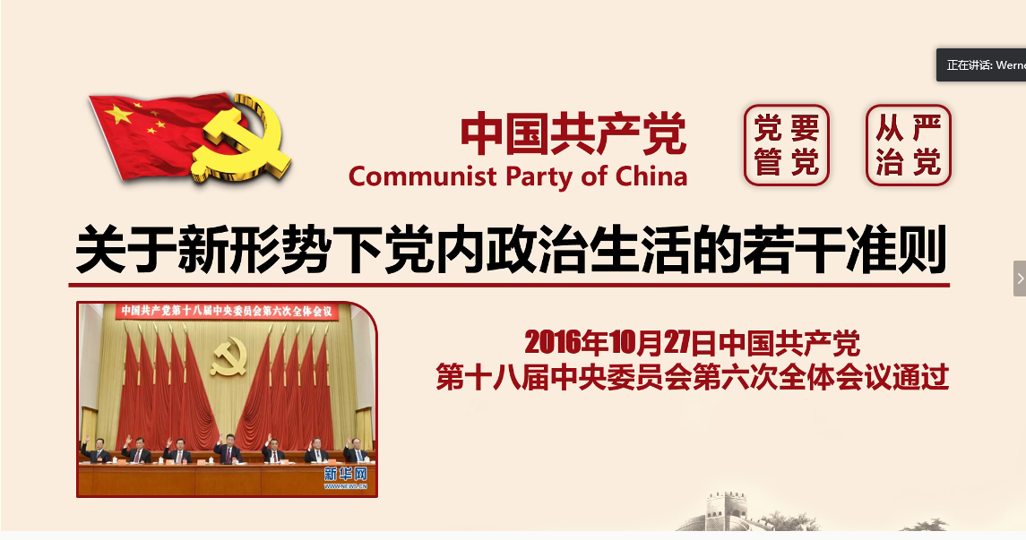 《关于新形势下党内政治生活的若干准则》专题由校友联络专干甘为讲授。甘为以“准则、政治生活、新形势”三个关键词对《新准则》的背景进行介绍,从坚定理想信念、坚持党的理想信念等12个方面对《新准则》的具体内容进行讲解,并强调作为一名学生党员发展对象要不断地加强学习、严格自律,不因为疫情在家而放弃自己的学习。