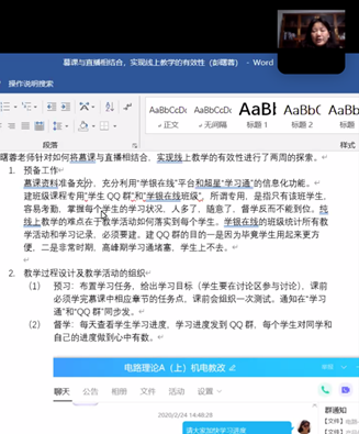 会上,我院周游、彭曙蓉和王媛媛三位老师分别总结了进行线上教学活动以来所积累的教学经验和线上教学软件使用心得,并与学院老师们进行了分享。虽然都是在线教学的经验分享,但三位老师教学风格各异。周游老师和王媛媛老师使用的Cctalk软件进行在线课堂教学,与大家分享了基于Cctalk的网络在线直播授课心得和体会,为学院老师演示了如何操作该软件,另外还比较了各在线视频直播软件和在线课堂软件各自的特点,以供在线教学软件种类选择参考。彭曙蓉老师分享了其使用慕课与直播相结合,加以QQ群的形式来实现线上教学的有效性。三位老师的经验分享受到了学院老师们的喜欢,会后学院群内老师们仍在讨论线上教学,学院内形成了互相分享线上教学质量提高方法的浓郁氛围,对提升线上教学效果和教学质量有积极促进作用。
