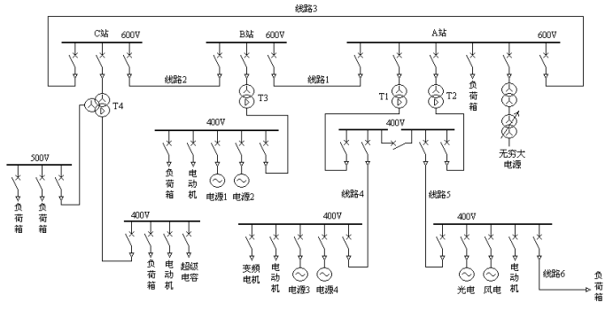 (2) 600V电压等级有3条进出支路,主接线采用单母线;每条支路所接设备(变压器或线路或电源或负荷)可灵活选择(B站与C站相同)。