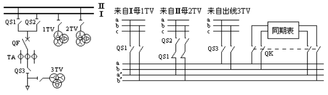 (6) A站#1、#8屏上各设一块MZ-10组合式同期表,用于无穷大系统与本站并列及本站与B或C站并列。每块屏内所设的同期接线如下图: