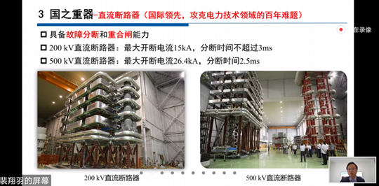 裴翔羽老师进一步对特高压直流输电领域的“国之重器”进行图片展示和技术介绍。在换流阀、直流断路器、柔性直流输电控制保护设备、直流电网快速行波保护装置以及直流电网实时数字仿真平台等关键装备和技术方面,我国已处于世界领先水平,真正实现了“中国引领”和“中国创造”。