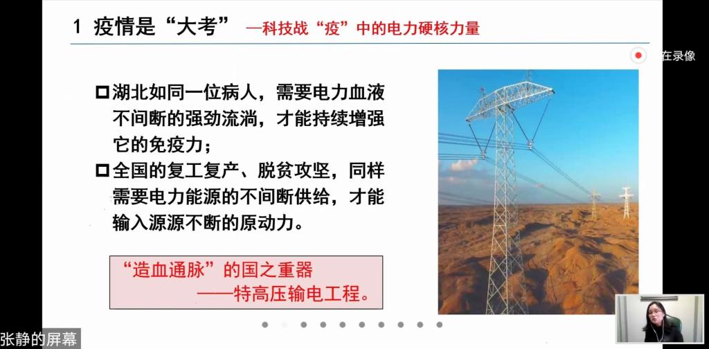 课堂上,张静老师通过介绍我国当前战“疫”的大好形势,引出电力领域在抗疫道路上作出的巨大贡献。“战疫保电,国网在行动。”国网从全局考量,分别从电力供应、物资供应、人员调配三个方面举全国网之力驰援武汉,重点介绍了火神山、雷神山等新建医院的电力可靠保障。她强调了湖北电网的战略地位并提出本次课程的“主角”—特高压输电工程,它是实现“国网一盘棋”的能源输送大工程,其关键装备与技术是“造血通脉”的国之重器。