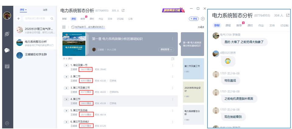 电气1704班资京同学说:“有如此负责用心的老师,何愁‘暂态’学不好,我们太幸福啦!” 学生的夸赞也得到了网络后台数据的印证,原本299人的课堂,最高时段有582人听课。