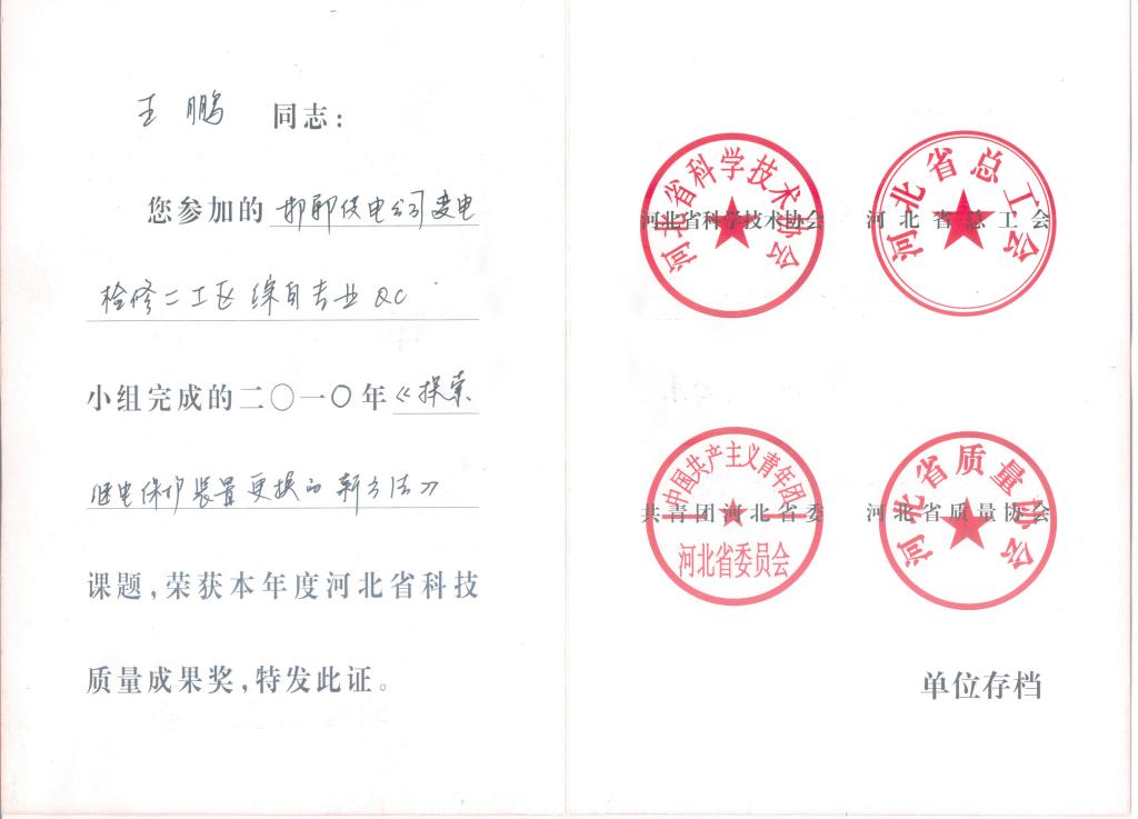 2010年经过三个月的刻苦学习,获得河北省电力公司厂站端调试检修员竞赛团体二等奖,个人第五名。在省公司综自专业比赛回来后,主持了变电检修二工区220kV留旺站的综自改造工作。在留旺站的综自改造期间,积极将自己学习到的自动化知识应用工程实际中去,取得了显著的效益。例如,利用自身继电保护专业优势,将常规变电站中央信号原理应用到变电站综合自动化系统远方事故退画面功能当中,解决该原有该技术不可靠的难题。该课题与利用手机短信普及自动化知识的课题一起在当年被河北省电力公司自动化专业推广。