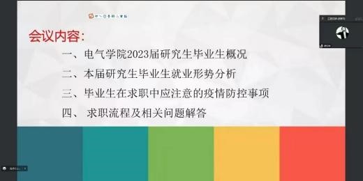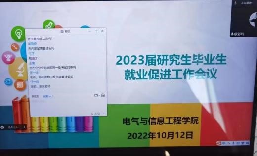 为帮助研究生了解当前就业形势,促进研究生顺利就业,2022年10月12日下午,电气学院召开了线上2023届研究生毕业生就业促进工作会议,欧彩玲老师主讲,2023届全体研究生参会。