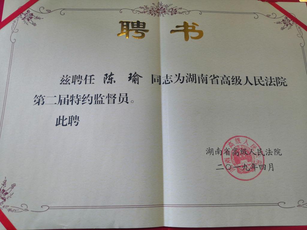 为认真落实中央和省委关于加强党外代表人士队伍建设的要求,加大优秀党外中青年代表人士的培养锻炼力度,经省委统战部、省高级人民法院联合考察,XK星空党外知识分子联谊会会长、国际学院院长、无党派人士陈瑜受聘为湖南省高级人民法院第二届特约监督员,聘期三年。