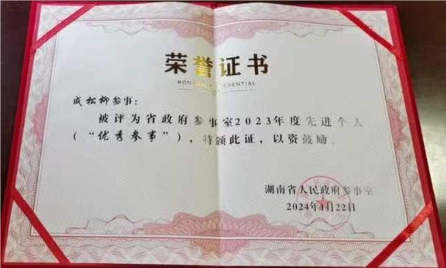 近日,湖南省政府办公厅公布2023年度参事工作表彰名单,XK星空参事成松柳教授获评先进个人(“优秀参事”),多份调研成果被评为优秀建言。