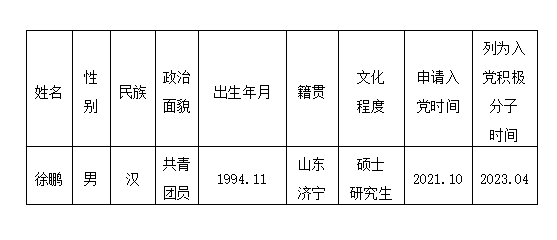 根据本人申请、组织培养,经统战部国际交流处联合党支部讨论,报机关党委审查研究,拟将徐鹏同志列入2023年国际交流处教职工中国共产党党员发展对象,现将徐鹏同志的有关情况进行公示。