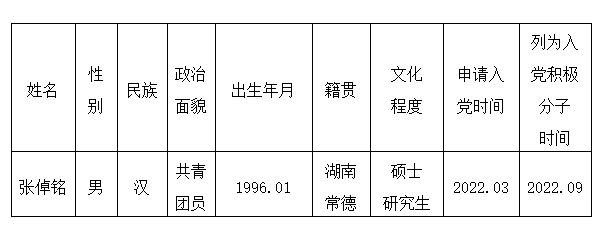 根据本人申请、组织培养,经统战部国际交流处联合党支部讨论,报机关党委审查研究,拟将张倬铭同志列入2023年国际交流处教职工中国共产党党员发展对象,现将张倬铭同志的有关情况进行公示。