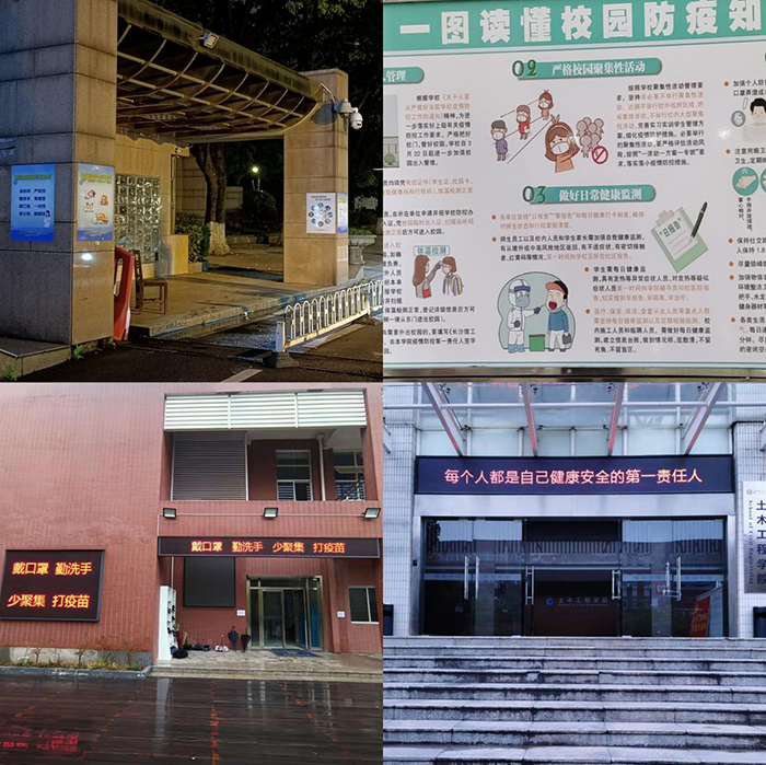 校园各处张贴宣传海报,广泛播放防疫宣传标语口号