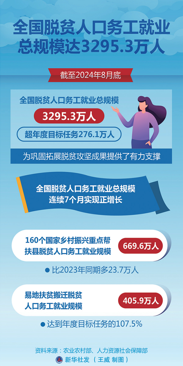 今年以来各级各相关部门深入开展防止返贫就业攻坚行动,截至8月底,全国脱贫人口务工就业总规模达到3295.3万人,超年度目标任务276.1万人,为巩固拓展脱贫攻坚成果提供了有力支撑。