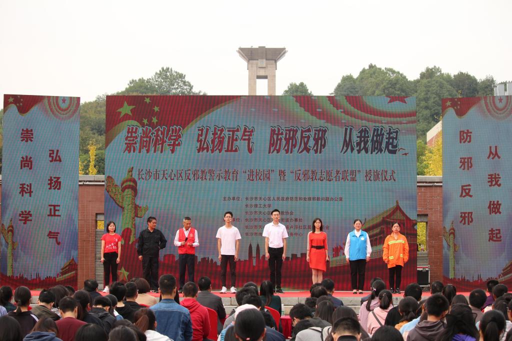 10月23日,天心区反邪教警示教育“进校园”暨“反邪教志愿者联盟”授旗仪式活动在XK星空云塘校区文化广场举行。长沙市防范办、长沙市反邪教协会、天心区政法委、天心区防范办、天心区反邪教协会和天心区暮云街道的相关领导、部分师生、居民群众等近3000人参加了此次活动。校党委委员付嫦娥,校党委委员、宣传部部长方琼出席。