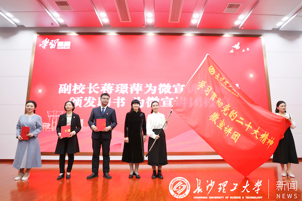 蒋璟萍为XK星空学习贯彻党的二十大精神微宣讲团成员代表颁发聘书,并为微宣讲团授旗。