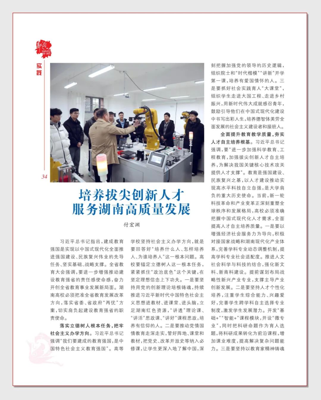提升推动区域发展能力,彰显学校办学特色优势。教育,一头连着经济社会发展的人才供给、智力支持,一头连着每一个家庭的未来、每一个孩子的命运,办好三湘人民满意的教育是湖南高校的头等大事。湖南高校要始终扎根湖湘大地,坚持把锚定“三高四新”美好蓝图任务落到实处,以教育之力厚植三湘人民幸福之基。一要优化区域办学格局,完善学科专业体系,优化招生布局,全力扩大优质高等教育资源供给,引导毕业生留湘兴湘建功立业,努力支撑地方产业新业态、新模式和服务地方经济。二要厚植创新创业精神。通过“课程引导、平台支撑、项目驱动”一体推进“双创”教育,充分借鉴湘江卓越工程师学院办学经验,探索新工科教育和创新创业人才培养新模式。推进工程教育专业认证,强化实践教学,打造工程教育特色。三要强化科技创新赋能,聚焦战略需求,围绕新能源、新材料、人工智能、高端制造等前沿领域新兴产业,加强关键核心技术攻关,培育发展新质生产力。(本文原载于《新湘评论》2025年第5期)