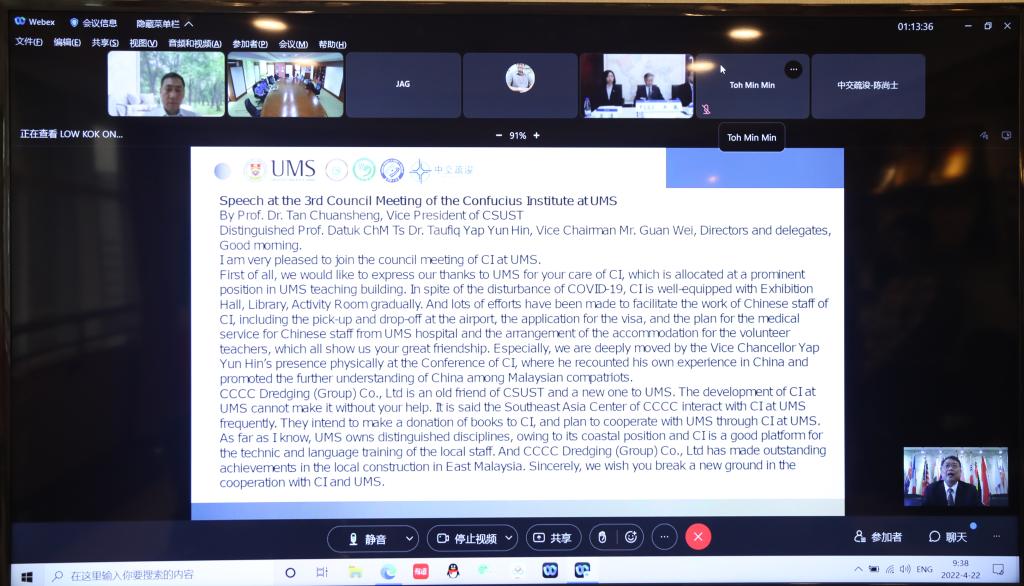 4月22日上午9点30分,沙巴大学孔子学院第三届理事会会议在线上举行,孔院三方暨全体理事会成员参加了会议。XK星空副校长谈传生、沙巴大学校长拿督Taufiq Yap Yun Hin教授和中交疏浚集团副总裁关巍先生出席并致辞。