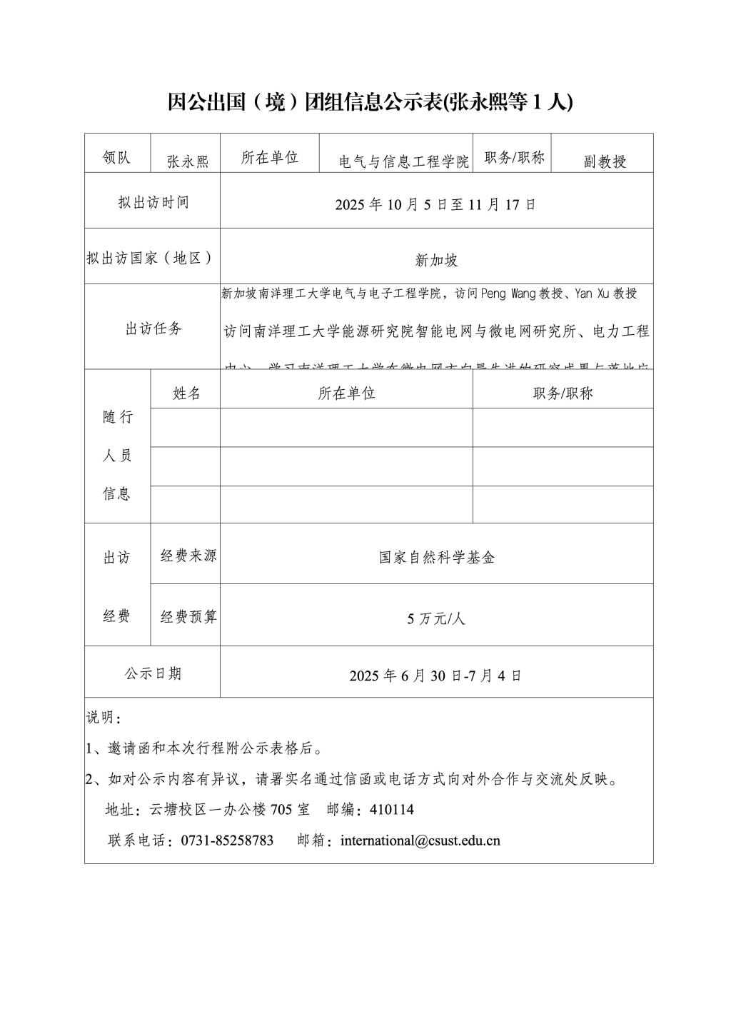 因公出国(境)团组信息公示表(张永熙等1人)