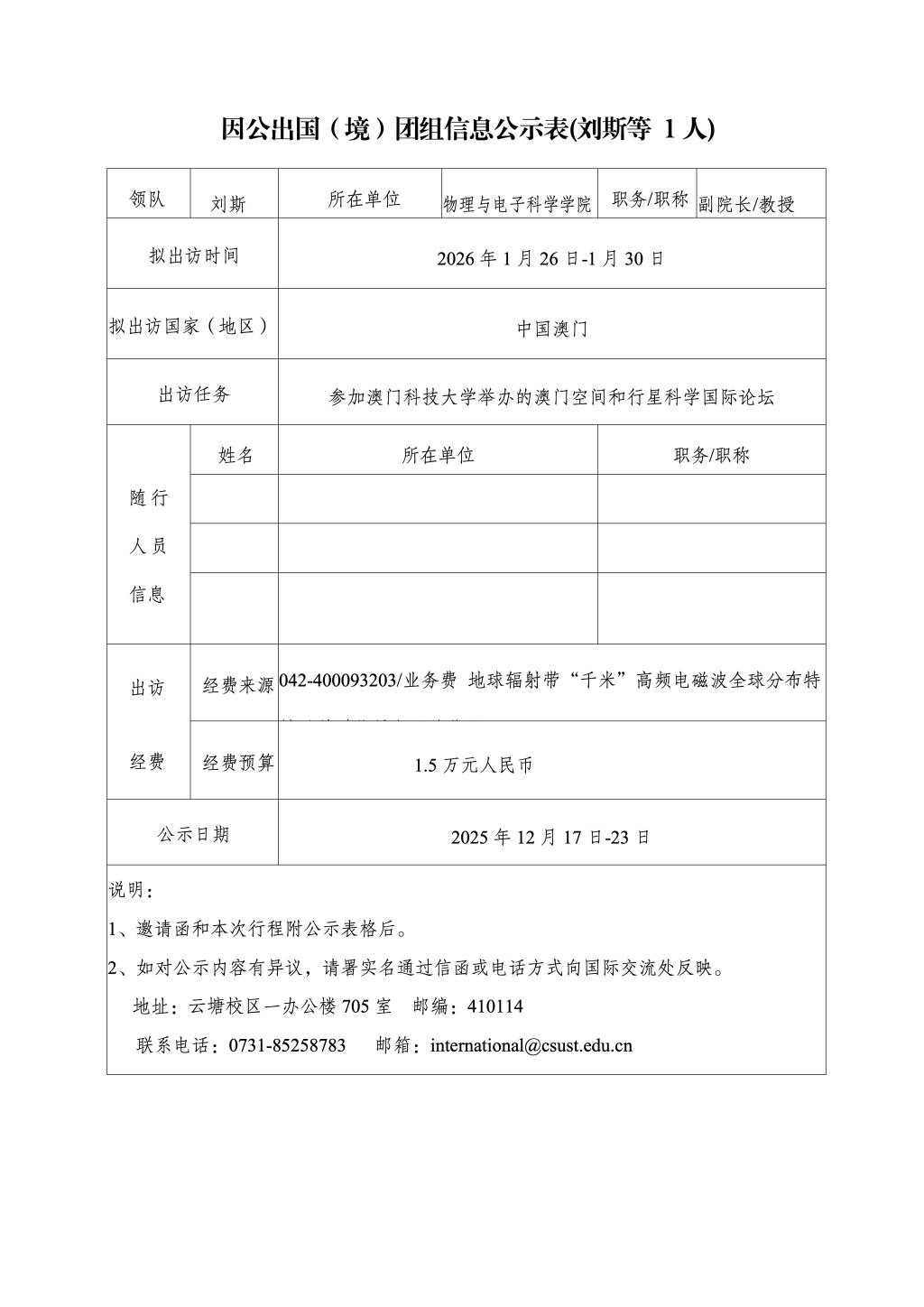 因公出国(境)团组信息公示表(刘斯等 1人)