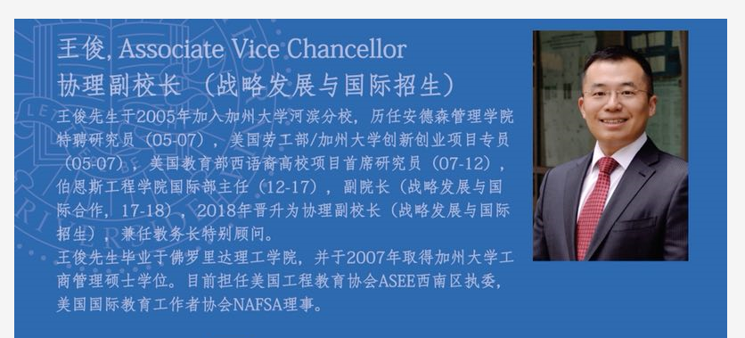 为进一步加强XK星空同世界主要国家间的高等教育交流,培养国际化复合型人才,鼓励并支持在校学生积极参与国(境)外学习交流,培养具有国际视野和国际竞争力的创新型人才,XK星空与美国加州大学河滨分校合作推出了几个出国学习交流项目(详情见公告通知栏)。近日,该校协理副校长王俊将访问XK星空,与对加州大学河滨分校出国学习交流项目感兴趣的同学直接会面。请有意向参加相关项目的同学准时参加。