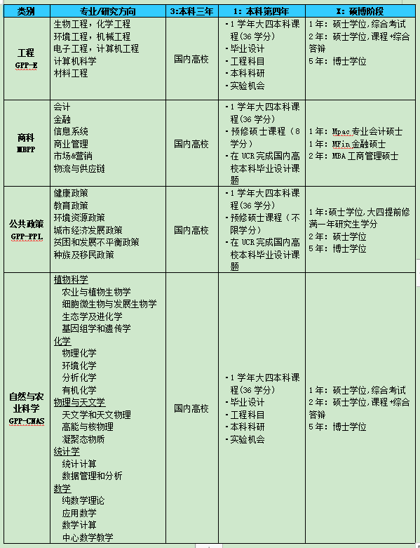 参加项目的学生在国内读完大学三年,大四学年进入加州大学河滨分校学习,根据自己的专业进入不同的学科方向,满足各学科申请要求,直接进入UCR硕博项目的学习,或者申请美国其他高校。