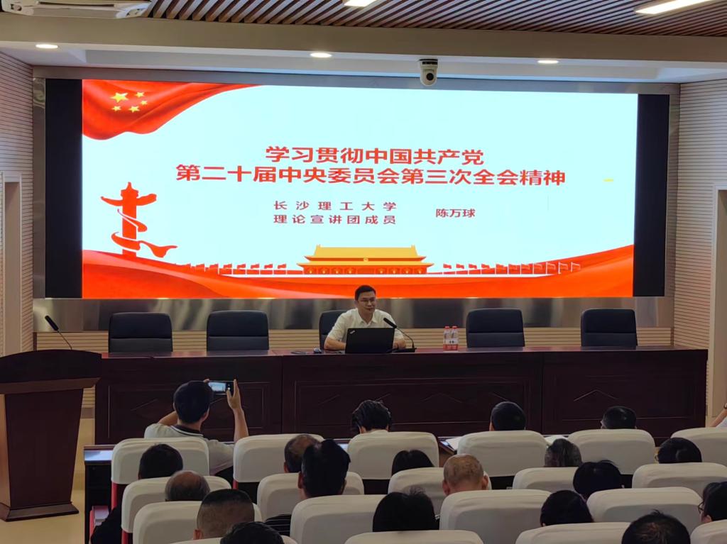 陈万球从深刻认识和把握这次全会精神,深入学习领会习近平总书记在党的二十届三中全会上的重要讲话精神,党的二十届三中全会对教育、科技、人才提出了新要求、新任务,进一步全面深化改革是建设高等教育强省的必由之路,进一步全面深化改革、奋力书就高等教育高质量发展的“长理新篇章”等五个方面,对党的二十届三中全会精神进行了系统阐释和深刻讲解。