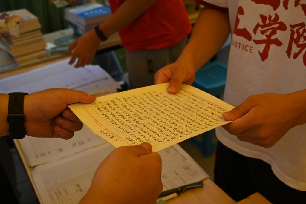 新生赵禹博在入党申请书中写到,“我的全家共有20多名党员,党的理想就是我的理想,在往后的学习生涯中要更加努力,锤炼品格,练就本领,开阔视野,报效祖国”。“入学前学院的下班党员就通过线上交流给了我很多的指引和帮助,今天来到学院党员示范岗的报到点,为人民服务深深地感染了我,更加坚定了我要成为一名光荣的中共党员的决心”,新生王辉在递交申请书的时候向我们说到,言语中饱含着深情和对加入党组织的渴望。