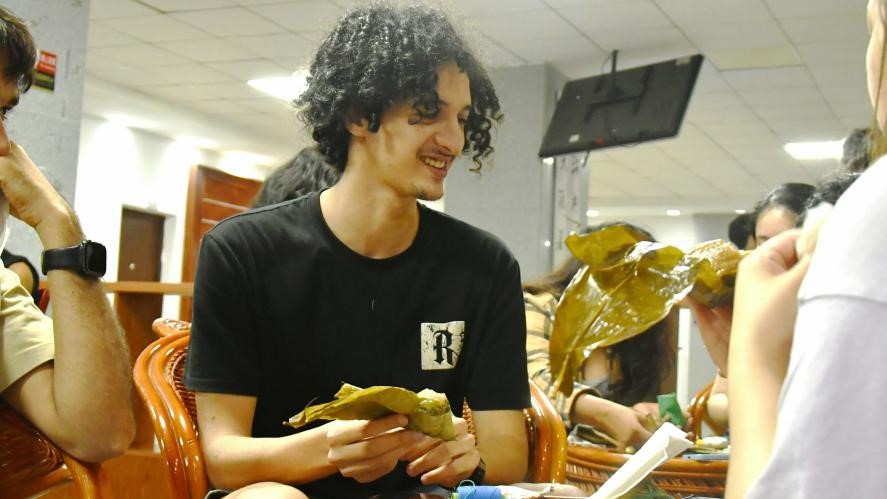 “我很感激有机会学习端午节相关的传统文化,品尝了美味的粽子。”来自摩洛哥的侯桑(HOUSSAM)骄傲地举起了手中缝制好的香囊,向中国学生展示着。端午佳节到来之际,国际工学院中外学子共同开展“浓情端午,与粽不同”国际青年文化沙龙活动,在知识竞答、动手实践、品尝传统美食中开启中华传统文化浸润之旅。