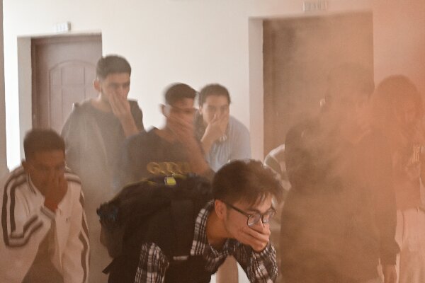 在逃生演练环节,敏行轩5栋学生公寓内模拟火灾环境,工作人员释放烟雾,公寓楼内响起消防警报。应急管理小组立即启动应急预案,工作人员分工协作,快速到达火灾模拟现场并展开应对,学生则按照疏散路线,迅速有序地撤离。