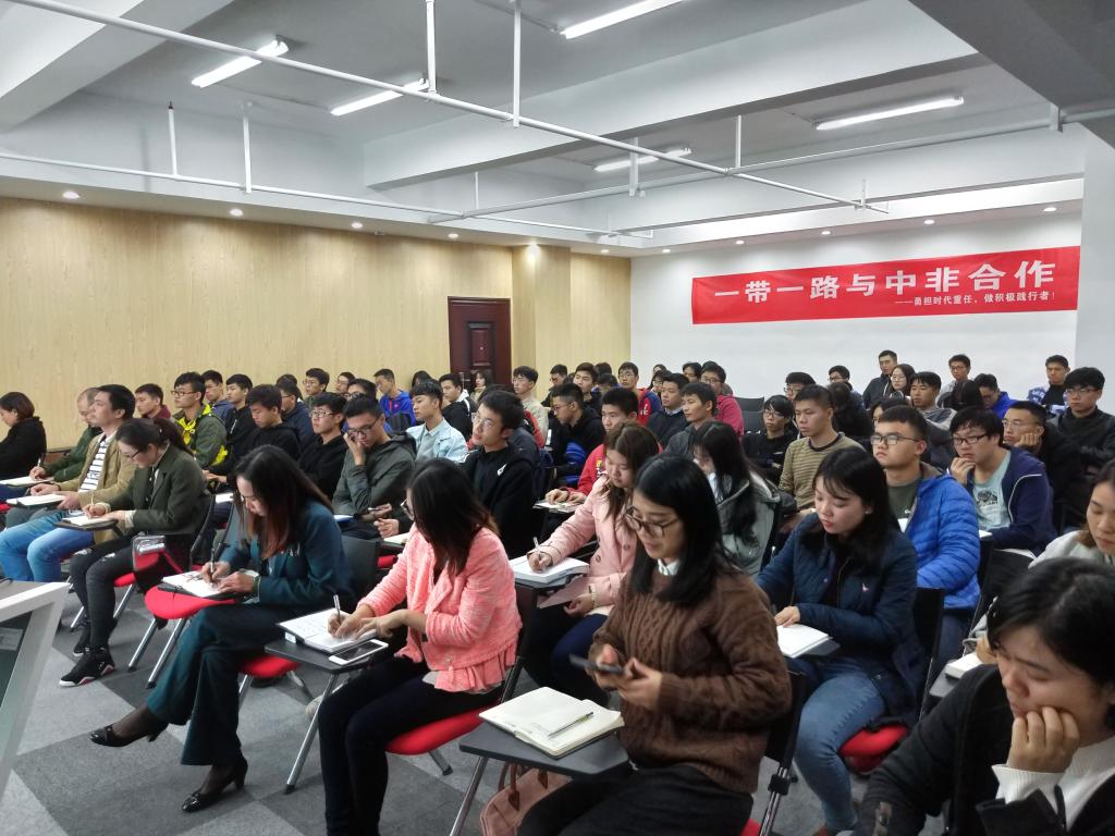 易显飞首先以习近平总书记在哈萨克斯坦纳扎尔耶夫大学的讲话为引,深刻阐述了“一带一路”倡议的基本背景,并从历史维度讲述了“一带一路”的演变历程及其重要意义,易教授以详实的数据,向大家展示了近年来“一带一路”倡议对我国和沿线国家经济发展所作的重大贡献。接着他从正确认识我国与非洲国家的关系,生动诠释了中非合作的无限前景。最后,易教授勉励全体同学:幸福是奋斗出来的,国际学院的学生应励志于国际视野的奋斗,勇担时代重任,做一带一路与中非合作的积极践行者。