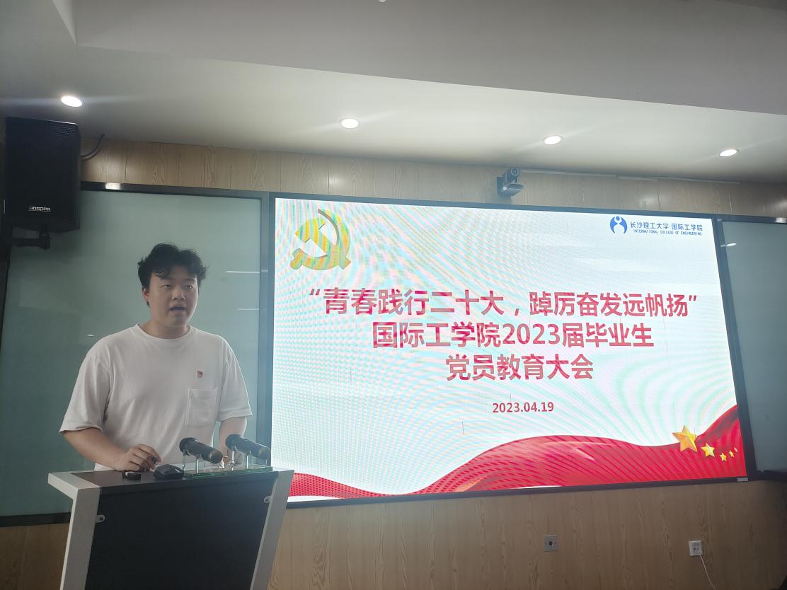 4月19日下午,国际工学院在新能源大楼1栋402报告厅召开2023届毕业生党员教育大会,国际工学院党总支副书记兼副院长乔法光、特邀党建组织员李争流、各学生党支部书记以及全体毕业生党员共同参会,会议由学生第一党支部副书记郑生辉主持。
