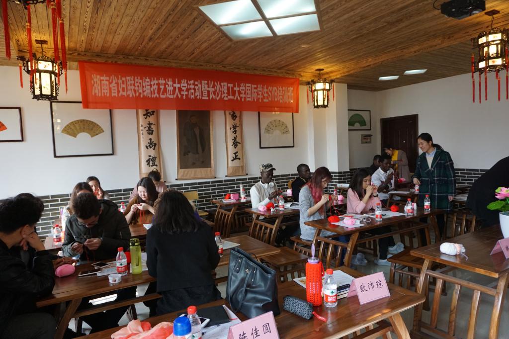12月9日上午,培训班在留学生公寓文化教室举行开班仪式。省妇联妇女发展部调研员韩杰、主任科员郑丽萍、长沙理工大国际学院党委副书记兼副院长吴振华、湖南省女红协会副会长欧沛琼、国际学院留学生工作办公室以及欧式手工针织工作室的老师们出席了仪式。国际学院获得“孔子学院奖学金”、“湖南省一带一路奖学金”的国际学生们作为培训班学员一同参加。