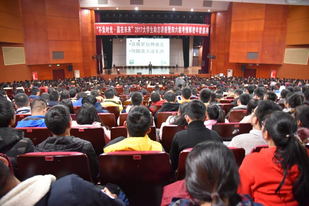 12月6日,国际学院和校团委联合举办的“不负时光,赢在未来”大学生励志讲座暨四六级考情解密年度盛典在XK星空云塘校区大会堂举行。长沙新东方学校副校长、优秀的四六级讲师、被称为“金山词霸”的范超老师走进XK星空,为同学们带来了一场青春励志和英语学习的盛宴。
