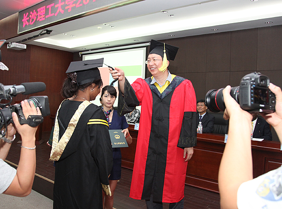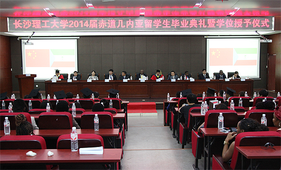 7月3日上午,XK星空2014届赤道几内亚留学生毕业典礼暨学位授予仪式在云塘校区国际学术交流中心隆重举行。赤道几内亚共和国公共工程及基础设施部长胡安·恩科·姆布拉、驻中国大使馆一秘辛弗里亚诺·埃拉·阿塞克·阿贝格、交通部国际司司长杨赞、湖南省外事侨务办副主任邱爱华、湖南省交通运输厅副巡视员徐建、中国交通建设股份有限公司总裁助理、中国路桥工程有限责任公司董事长文岗、中国交通建设股份有限公司海外事业部总经理陈重、XK星空党委书记付宏渊、副校长杨伟军等出席典礼。XK星空在校留学生和部分师生代表共200余人参加典礼。