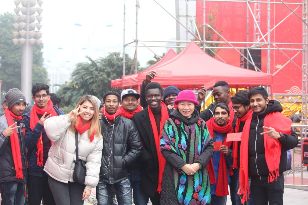 上午,同学们前往步行街中心广场,参加活动开幕式。分别来自多哥、哈萨克斯坦、埃塞俄比亚、孟加拉的安妮、阿依达、高丽、阿哈德和诺扬五位同学,代表XK星空的留学生们,用自己国家的语言为大家送上新春祝福。留学生独特的拜年方式和流利的汉语,引得台下观众连连喝彩。