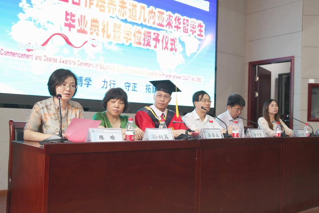 7月12日上午,2018届赤道几内亚来华留学生毕业典礼暨学位授予仪式在云塘校区工二B区多功能厅隆重举行。副校长蒋昌波、校党委委员兼国际学院党委书记付嫦娥、国际交流处处长吴迪龙、校友中心副主任郑延恒、土木工程学院副院长陈伏彬、经济与管理学院副院长谢朝华,留学生资助方中国路桥工程有限责任公司董事、总会计师董付堂、人力资源部副总经理宫海龙、人力资源部许囡,国际化人才培养实习基地湖南路桥建设集团有限责任公司工会主席孙纳英、人力资源部副部长陈新伟出席。参加典礼的还有国际学院国际学生工作办公室全体老师、2018届赤道几内亚毕业生的亲朋好友以及黑山孔子学院到XK星空参加夏令营的全体营员等。毕业典礼由国际学院院长陈瑜主持。