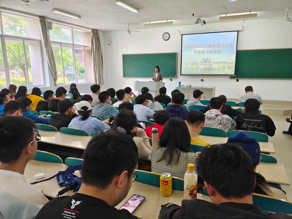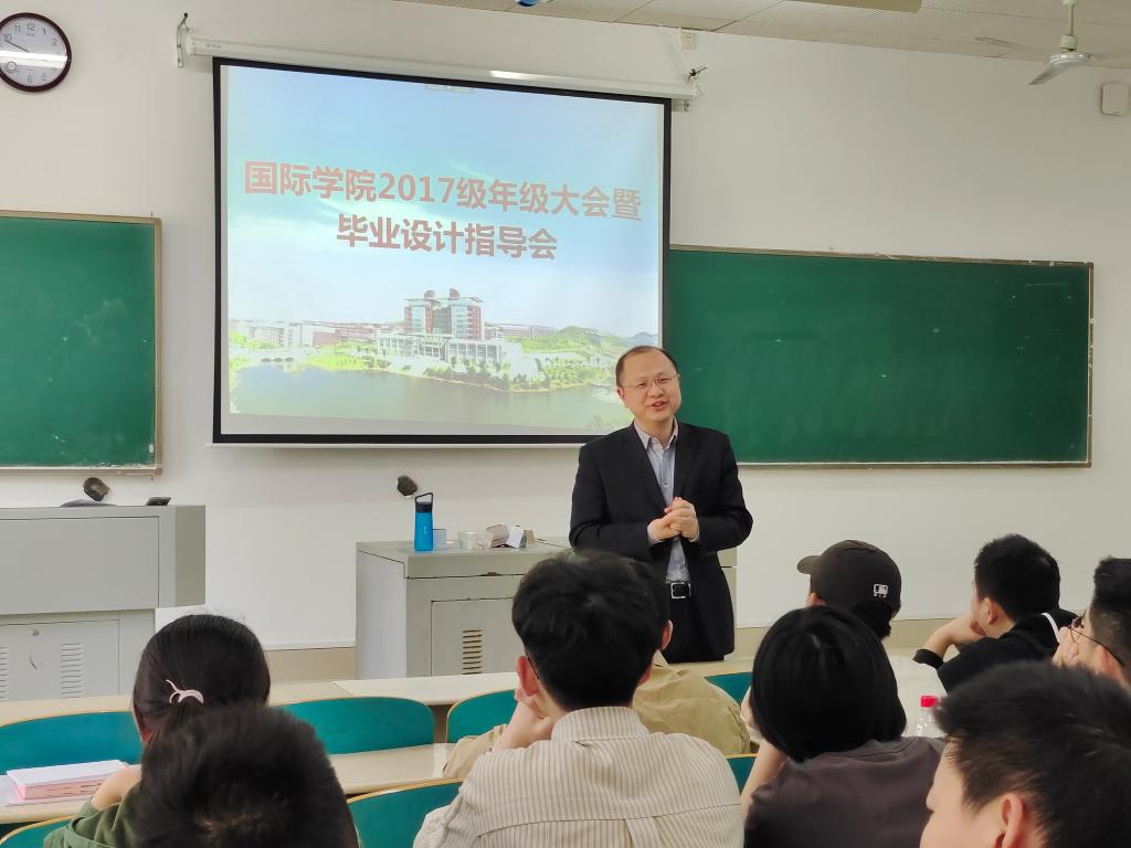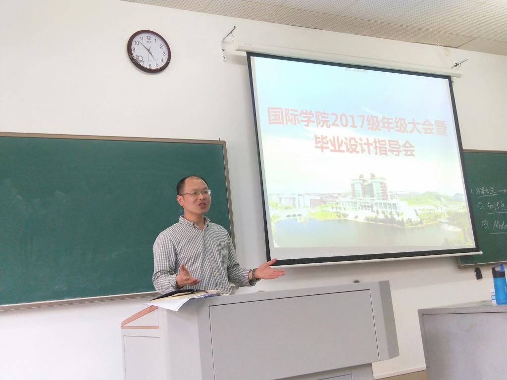 为更好推进中外合作办学项目(土木工程专业)2017级毕业班学生毕业设计、课程学分修读以及毕业教育等工作,帮助学生圆满完成本科阶段学业,国际学院于4月29日下午在云综教A106组织召开了2017级年级大会暨毕业设计专题交流会。国际学院院长吴迪龙,副院长秦卫星,以及教务办、学工办相关老师参会,会议由教务办负责人罗帅主持。