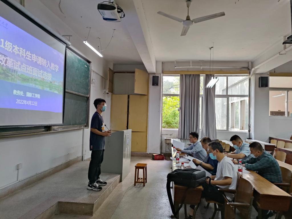 2022年4月12日上午,来自教务处、电气、汽机、能动、水利、外语、国际等职能部门与教学院的10名专家组成2个面试专家组,在金盆岭校区3教学楼214和216教室分别对申请转入教学改革试点班初审合格的20名同学,按照面试工作方案进行现场面试,由国际工学院党总支书记刘安生、国际工学院院长吴迪龙分别担任面试组长。同学们首先以中英双语进行了精彩的自我介绍,简要陈述了申请转入教改班理由以及未来学业规划。随后专家们从思想道德素质、知识素养、语言表达能力、分析解决问题能力、社会实践经验、创新精神与能力、专业发展规划等方面对学生进行综合评价,以百分制给出面试成绩。经转专业领导小组讨论,确定拟录取学生名单,并完成了学院官网公示及材料上报等系列工作。10位来自交运、电气、水利、土木、能动、经管等6个学院的2021级优秀本科生最终获得入选土木类和机电类教学改革试点班学习资格。