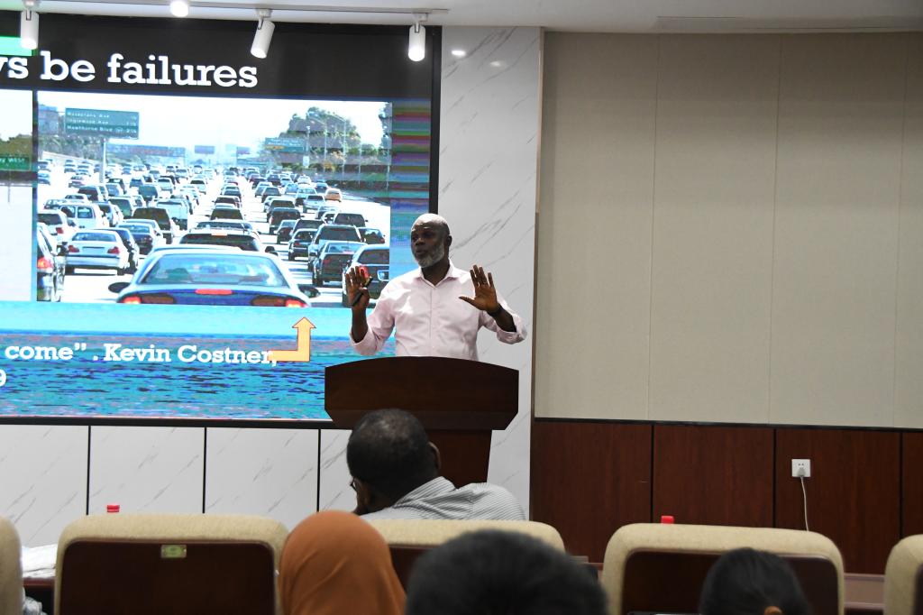 随后,佐治亚大学的Robert Baffour教授则以《工程决策的复杂性及其在工程事故中的应用导论》为题,为师生们带来了另一场精彩纷呈的报告。Baffour教授结合国内外工程重大事故案例,深入剖析了设计差错、施工失误等因素对工程安全的影响,让学生们对工程决策的重要性和复杂性有了更为直观的认识。他强调,在工程实践中,必须充分考虑各种不确定因素和潜在风险,以确保工程的安全和稳定。