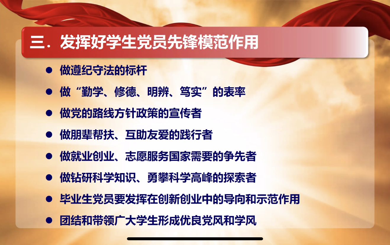 会议第三项,党总支副书记兼副院长张锐向学生党员就发挥好学生党员先锋模范作用做出指示。书记首先概括了学院学生党支部基本情况,随后对学院学生党建的标准和要求提出要务实创新的总体思想,最后对如何发挥好学生党员先锋模范作用提出八点要求:做遵纪守法的标杆;做“勤学、修德、明辨、笃实”的表率;做党的路线方针政策的宣传者;做朋辈帮扶、互助友爱的践行者;做就业创业、志愿服务国家需要的争先者;做钻研科学知识、勇攀科学高峰的探索者;毕业生党员要发挥在创业创新中的导向和示范作用;团结和带领广大学生形成优良党风和学风。