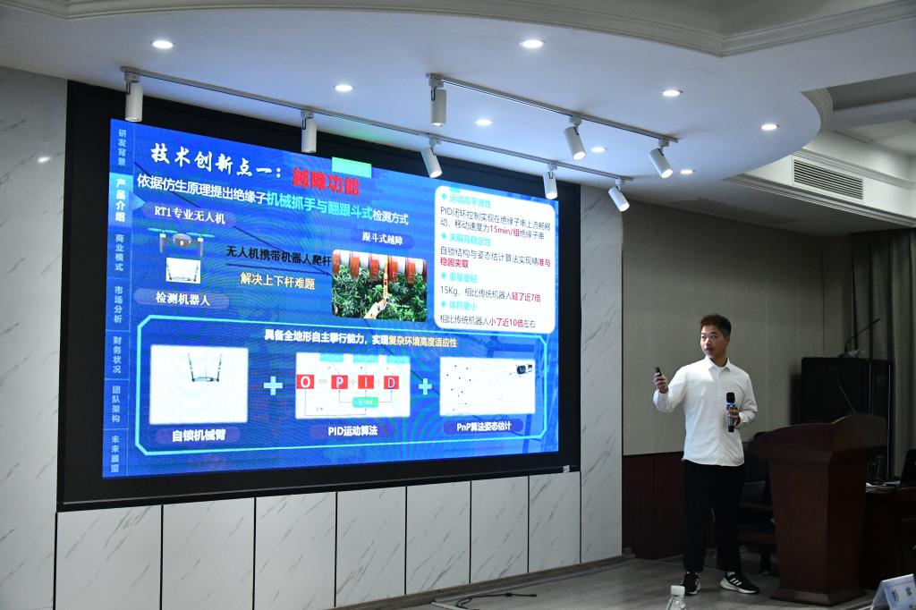 各个项目团队聚焦前沿科技领域,结合多学科知识,开发出既有技术突破又具备实际应用价值的创新方案。比赛现场,《超高压绝缘子动态监测与智慧清洁机器人》《触微知著—基于微纳探针的结构表面力学特性原位智能感知》等项目详细讲解了技术的创新点、在实际应用场景中的独特优势,以及如何将研究成果转化为实际产品,展现了从实验室研究到产业应用的完整过程。评审老师分别从科学性、先进性、现实意义等方面做出指导,提了深化商业模式验证加强实地考察与实践探索注重技术迭代升级以增强市场竞争力等有力意见。