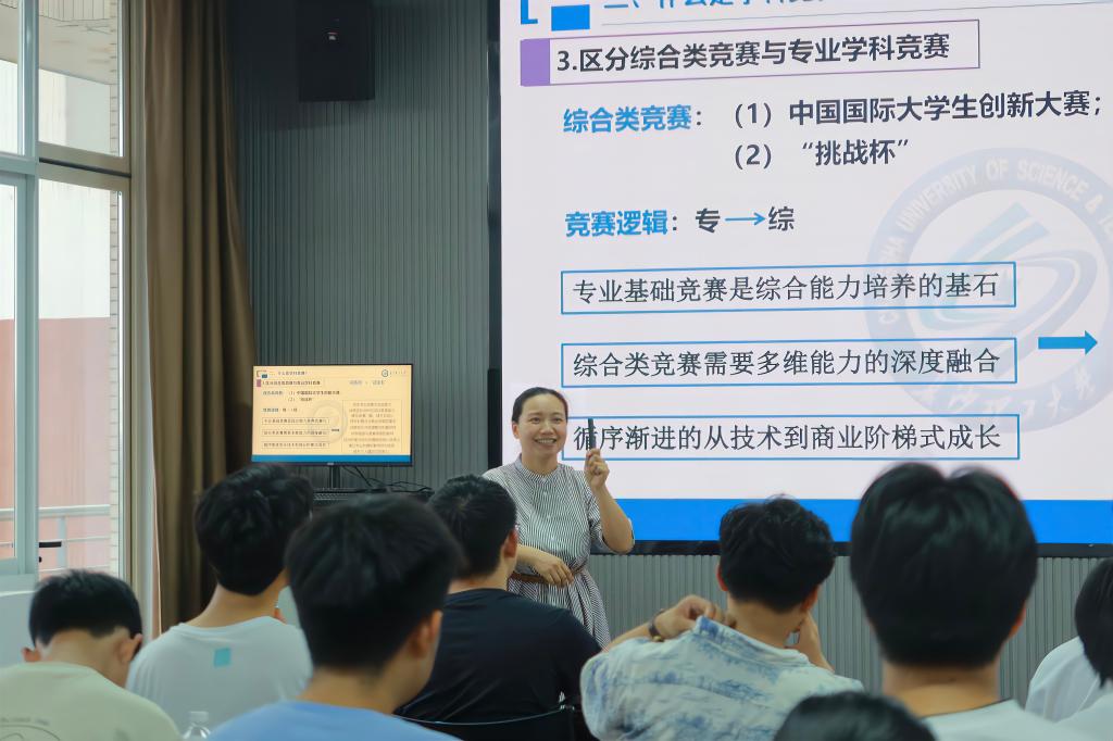 会上,黄文卫以《国际工学院大学生学科竞赛“三问”》为题,围绕什么是学科竞赛、为什么要参加学科竞赛、以及如何参加学科竞赛三个方面展开细致讲解。她主要介绍了适合中外合作办学项目学生参加的主要赛事,梳理了综合类竞赛与专业基础竞赛之间的逻辑,展示了学院近年典型的项目案例及其培育过程,总结分析了近两年综合类竞赛学院选拔赛上暴露出的主要问题她告诉同学们学科竞赛是深化专业学习的重要抓手,能够帮助其增强科研创新意识,开拓课外学术视野、提高工程实践能力、提升个人综合素质。她鼓励同学们基于课程引导,结合个人兴趣,主动靠近专业导师,走进实验室,以问题为导向,孵化核心成果,继而依托团队深耕项目,为取得竞赛成果一步一步打牢基础。