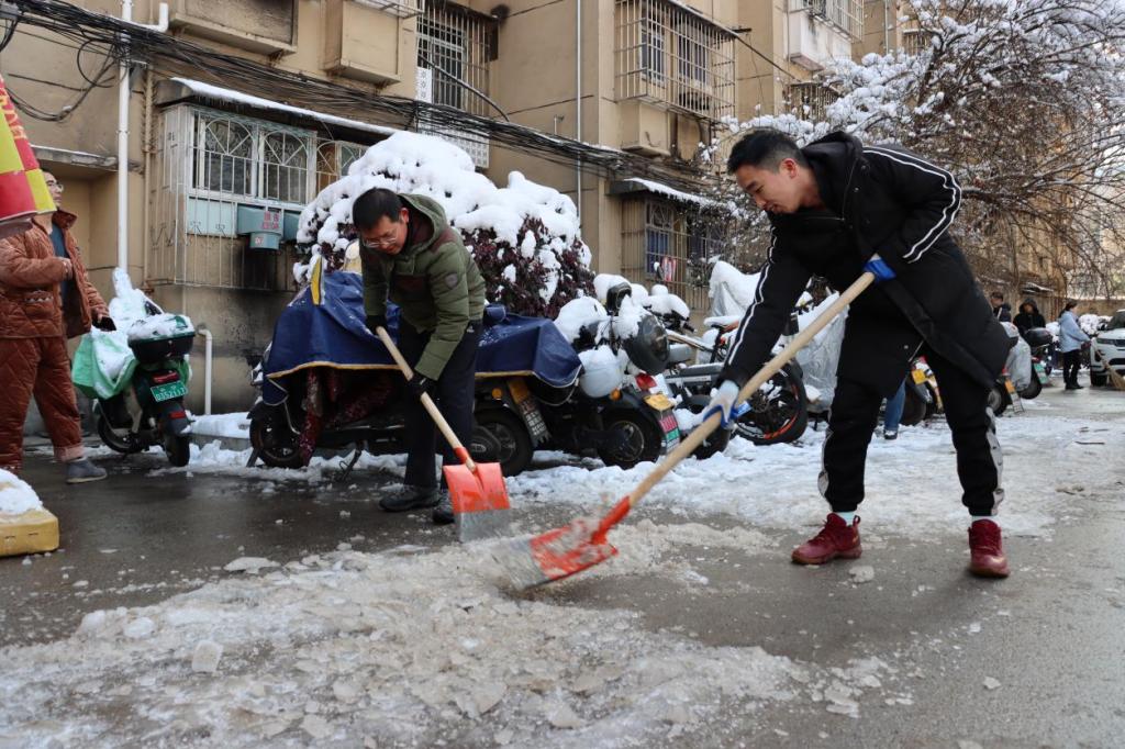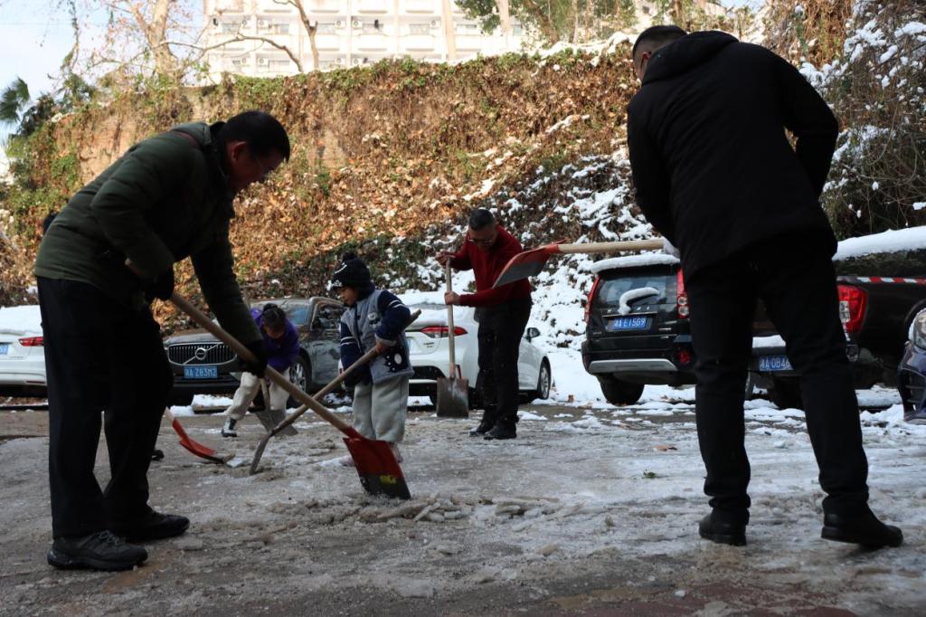在党支部书记、总经理任宇的指挥带领下,党员、积极分子迅速响应、纷纷出动,大家不畏严寒、干劲十足,有的用铁铲除冰,有的用扫帚扫雪,手中工具不停挥舞,胸前党徽格外耀眼,忙碌的身影形成一道靓丽的风景,路过的群众纷纷驻足称赞。经过近两小时的奋战,学校西门道路及附近家属区路面、楼道出口的积雪、冰块被清扫得干干净净,大大方便了大家安全出行。