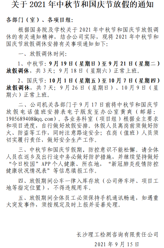 关于2021年中秋节和国庆节放假的通知