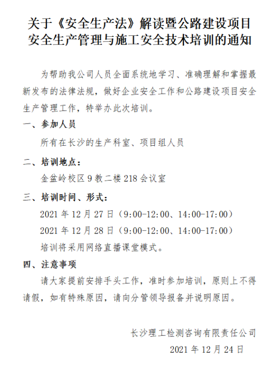 根据《2020年开展安全生产培训和检查的工作方案》要求,并结合公司实际,决定开展安全生产相关理论知识培训,现将培训有关事项通知如下:一、培训地点:金盆岭校区9教二楼218会议室二、培训时间:2020年6月18日(星期四)上午9点三、授课师资 刘山健(湖南省交通建设质量安全监督管理局副局长)四、参加人员公司全体人员五、注意事项请大家提前安排手头工作,提前十分钟进入会场签到,无特殊原因不得请假。 长沙理工大公路...