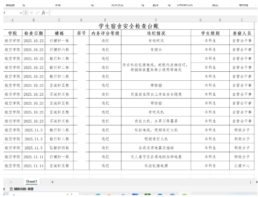 为落实学生宿舍安全工作,切实保障同学们的住宿安全,航空工程学院团委学生会生活权益部于2025年11月8日组织开展了“筑牢安全防线,标识温暖人心”学生宿舍安全隐患专项排查活动。